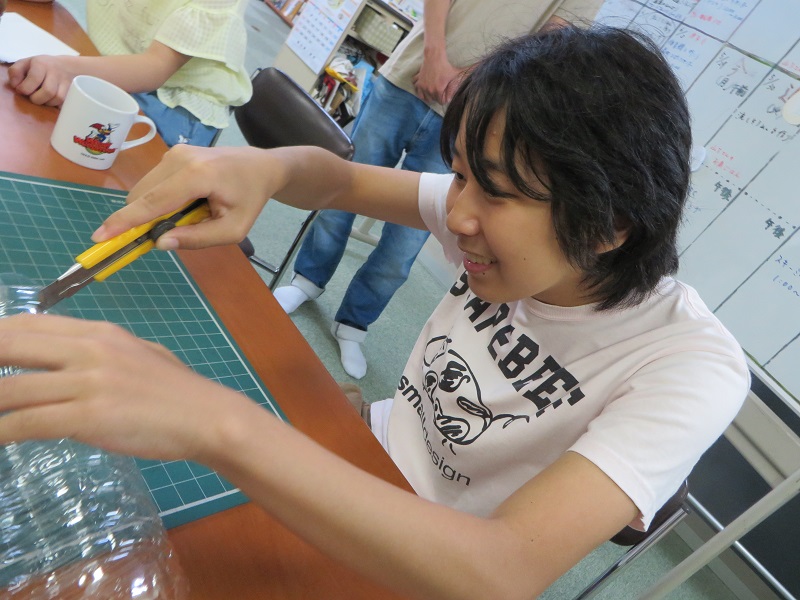 ペットボトルの上下を切り落として、縦半分に切り